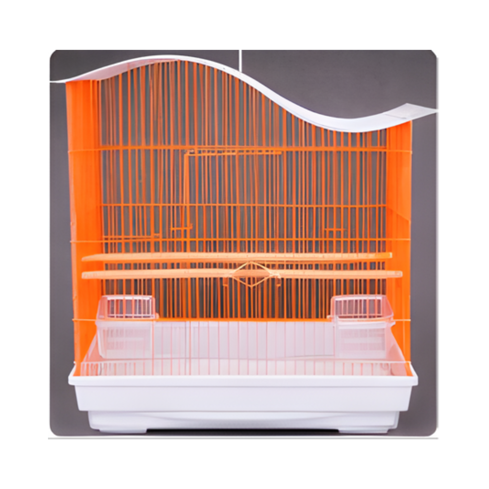 Removable plastic tray. 2 feeders, 2 plastic perches.