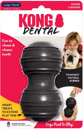 Το παιχνίδι σκύλου KONG Dental είναι κατασκευασμένο από καουτσούκ και έχει σχεδιαστεί για τον καθαρισμό των δοντιών και των ούλων, ενώ παρέχει την κατάλληλη διέξοδο για μάσημα και υποστήριξη των ενστικτωδών αναγκών ενός σκύλου. Κατασκευασμένο από τη φόρμουλα Extreme Rubber της KONG, το παιχνίδι KONG Dental έχει ραβδώσεις που βοηθούν στον καθαρισμό των δοντιών. Γεμίστε τις κορυφογραμμές και το κέντρο του παιχνιδιού με τις αγαπημένες λιχουδιές του σκύλου σας για επιπλέον απόλαυση. Θέλετε να παρατείνετε τον χρόνο μάσησης του σκύλου σας; Γεμίστε το με KONG Snacks και δελεάστε τους με ένα κουτάκι KONG Easy Treat.