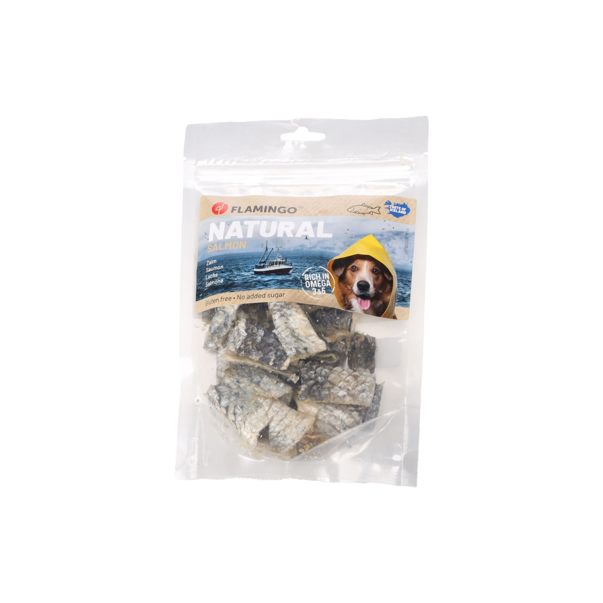 Treat your furry friend to this delicious salmon skin snack! Gluten-free, sugar-free, and packed with omega 3 and 6 for a shiny coat and a happy heart. Made in Europe, each snack is unique and may vary in shape and weight. Let your four-legged pal enjoy the taste of the sea!
