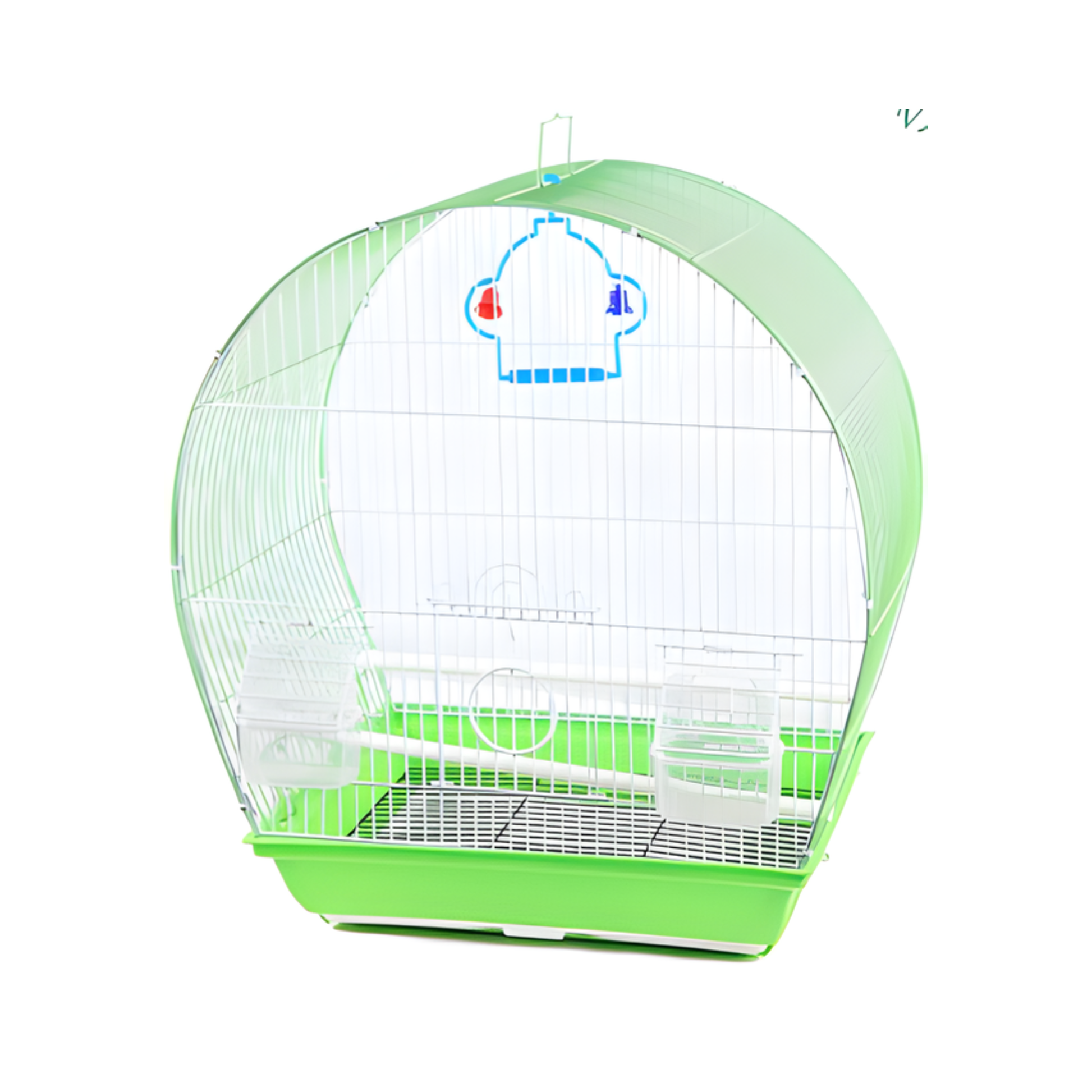 Removable plastic tray. 2 feeders, 2 plastic perches.