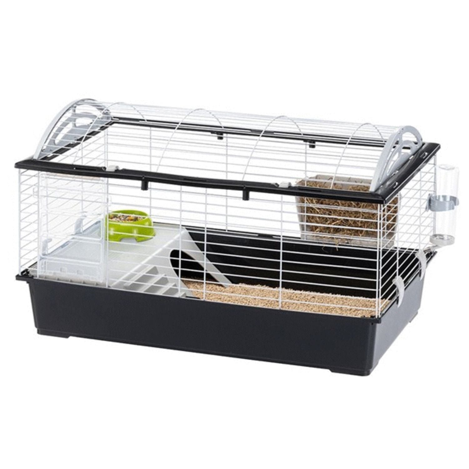 Inside, you will find a watering trough, feeder, house and a plastic hay rack. It can be easily cleaned thanks to a door that can be fully opened.