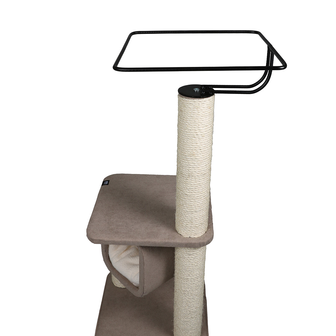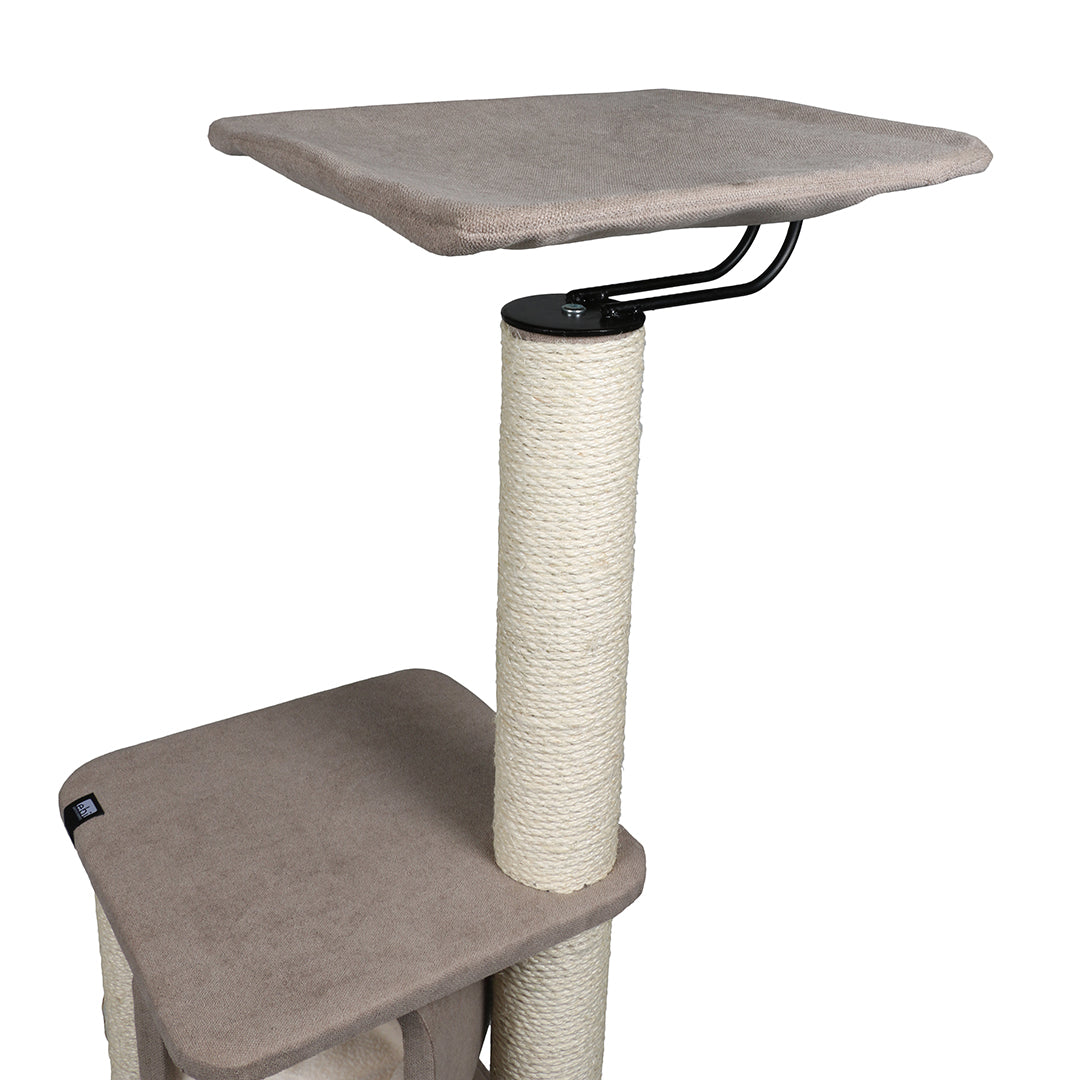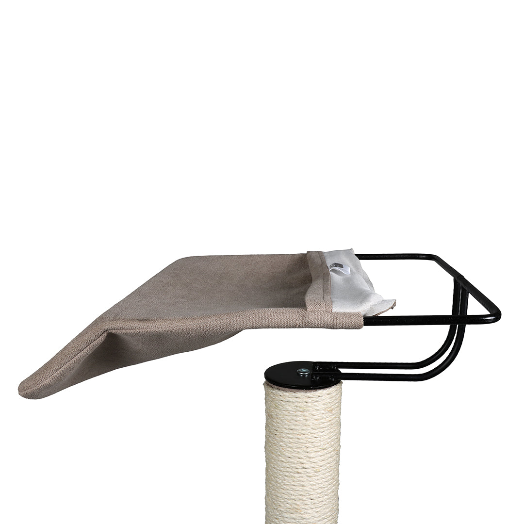 For cats a quality scratcher is necessary to take care of their nails and to mark their territory. Sisal is a natural and very robust fiber that helps the cat remove the flaky top layer of the nails. This prevents in growing nails. A scratcher is therefore a must for every cat! The EBI cat tree ‘Okinawa’ is a Dutch Design, inspired by the Japanese Zen concept. The aesthetics of this pole resemble calmness, and minimalism. So, this pole, covered in soft interior fabric, matches every interior. This pole contains cave with teddy-fur cushion, for a very comfortable sleep. Above the cave we’ve placed a board that contains a foam filled fabric, with a tunnel attached underneath. The highest part of this pole is our own designed steel hammock with washable sleeve. This will make this pole the favorite hangout spot for your cat.