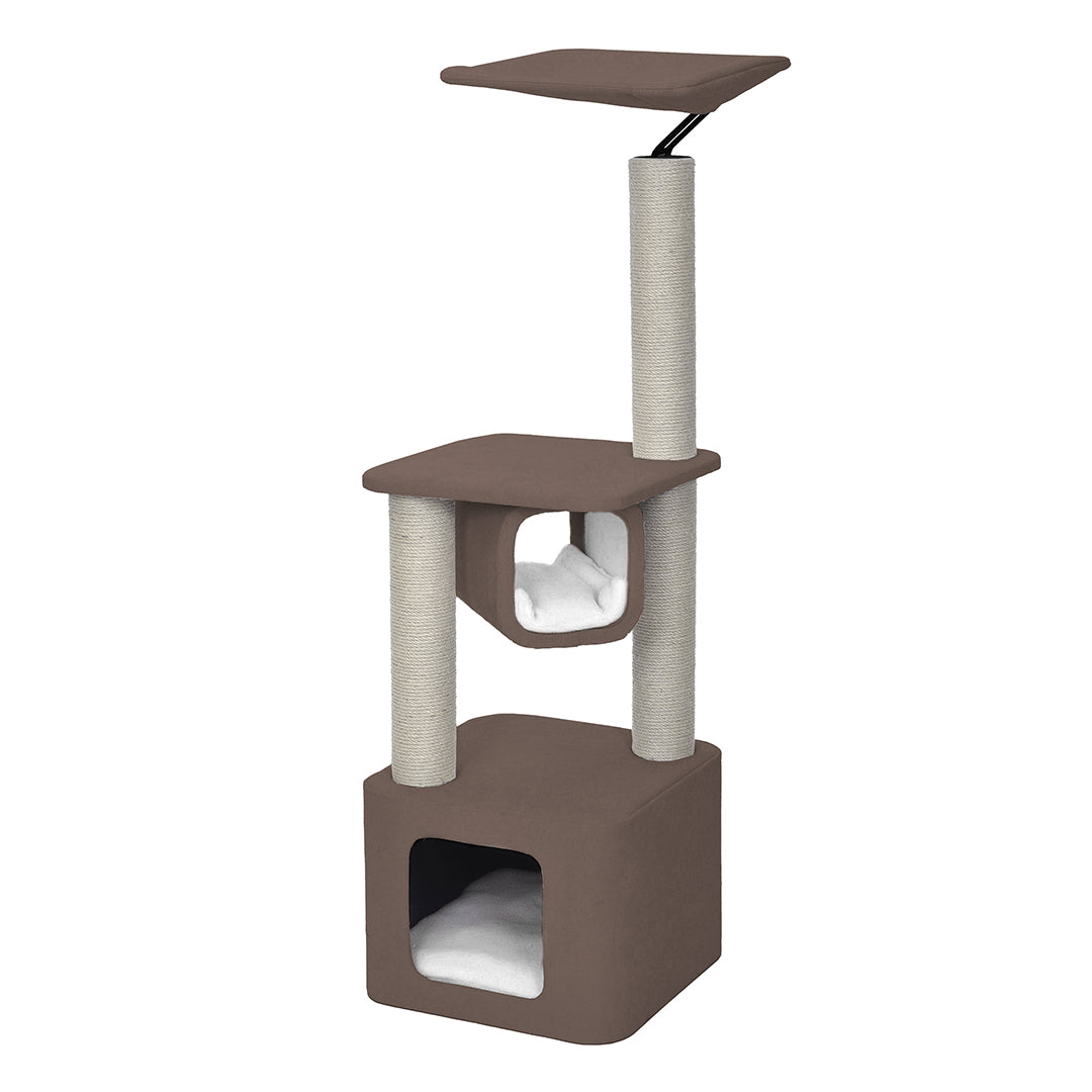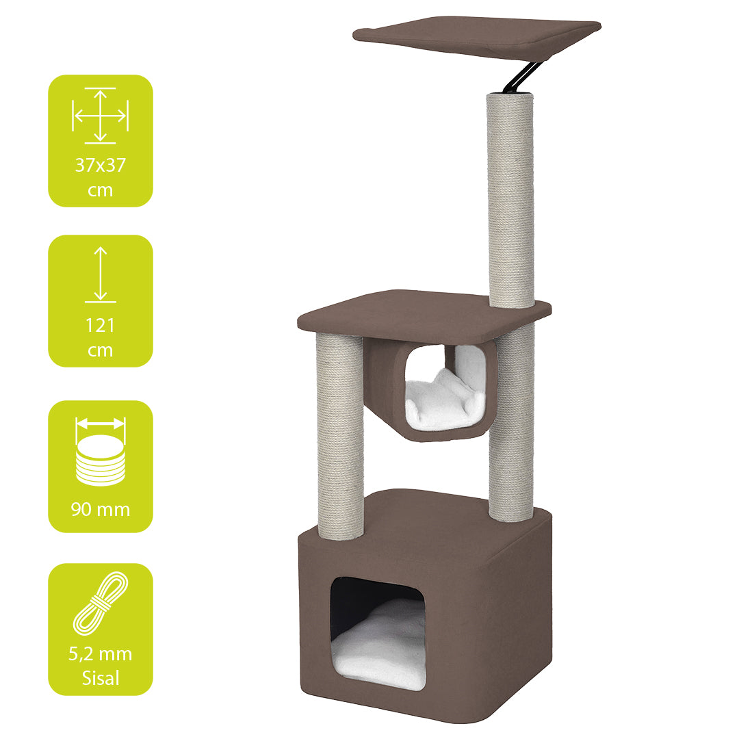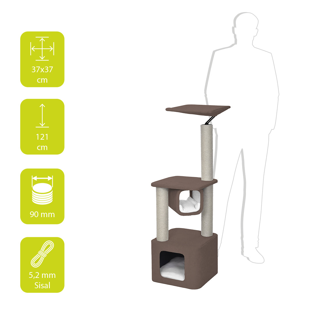 For cats a quality scratcher is necessary to take care of their nails and to mark their territory. Sisal is a natural and very robust fiber that helps the cat remove the flaky top layer of the nails. This prevents in growing nails. A scratcher is therefore a must for every cat! The EBI cat tree ‘Okinawa’ is a Dutch Design, inspired by the Japanese Zen concept. The aesthetics of this pole resemble calmness, and minimalism. So, this pole, covered in soft interior fabric, matches every interior. This pole contains cave with teddy-fur cushion, for a very comfortable sleep. Above the cave we’ve placed a board that contains a foam filled fabric, with a tunnel attached underneath. The highest part of this pole is our own designed steel hammock with washable sleeve. This will make this pole the favorite hangout spot for your cat.