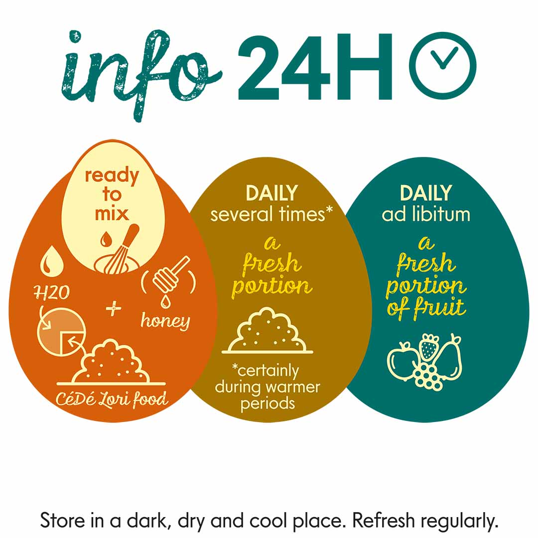- Mix 1 part CéDé Lorifood with 3 or 4 parts of water. Some lori species prefer their porridge sweeter, therefore you can add some liquid honey to the porridge. If possible administer several times a day a fresh portion, certainly during warmer periods. Daily a fresh portion fruit can be given. Store in a dark, dry and cool place.