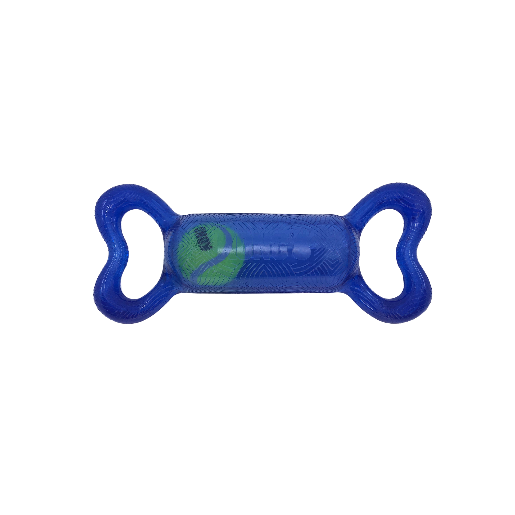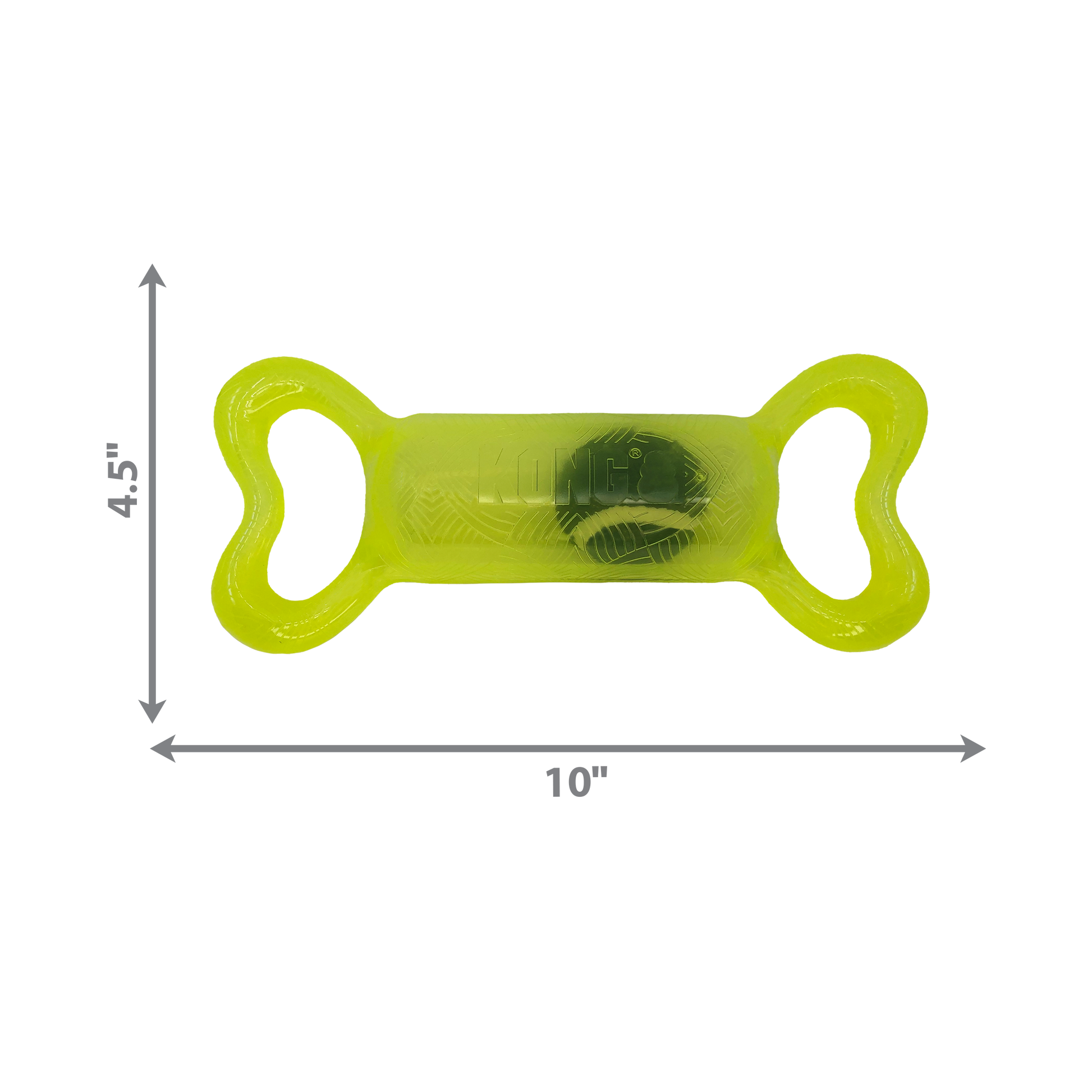 KONG Jumbler Tug Bone’s rolling interior tennis ball and loud squeak spark tug-and-fetch fun. This durable toy is built to last through tough play with two handles that make tugging and shaking easy for long-lasting rounds of interactive play.