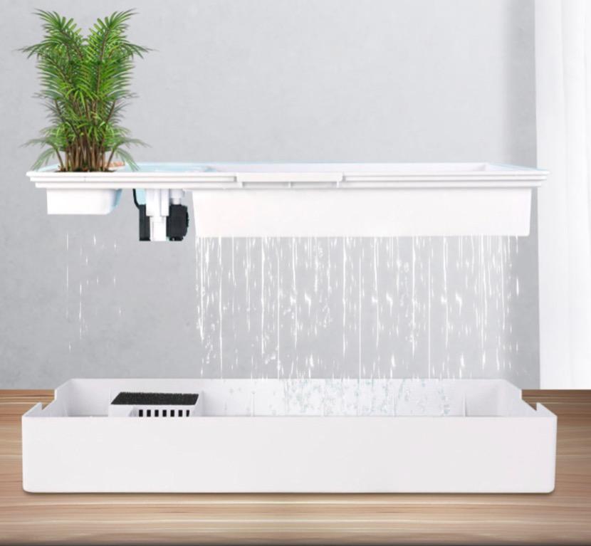 There is a planter that can host aquatic plants, which feed on the impurities in the water.