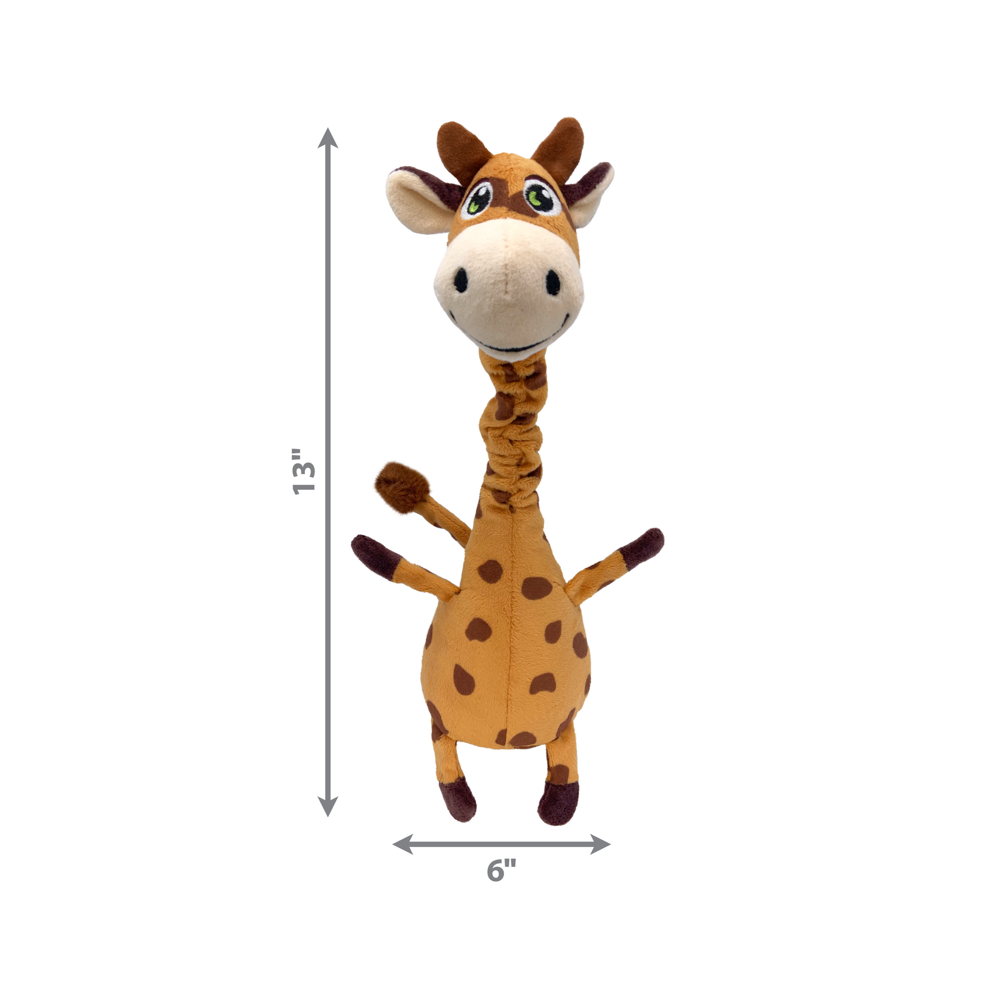 KONG Shakers Bobz Giraffe has a robust, flexible rope in his wobbling neck that allows him to nod, inviting him to thrash his long, floppy body in an instinct-satisfying safari of shaking. The low-toned squeaker enhances playtime, and a layer of reinforcement adds to the tugging, fetching, and tossing pleasure.