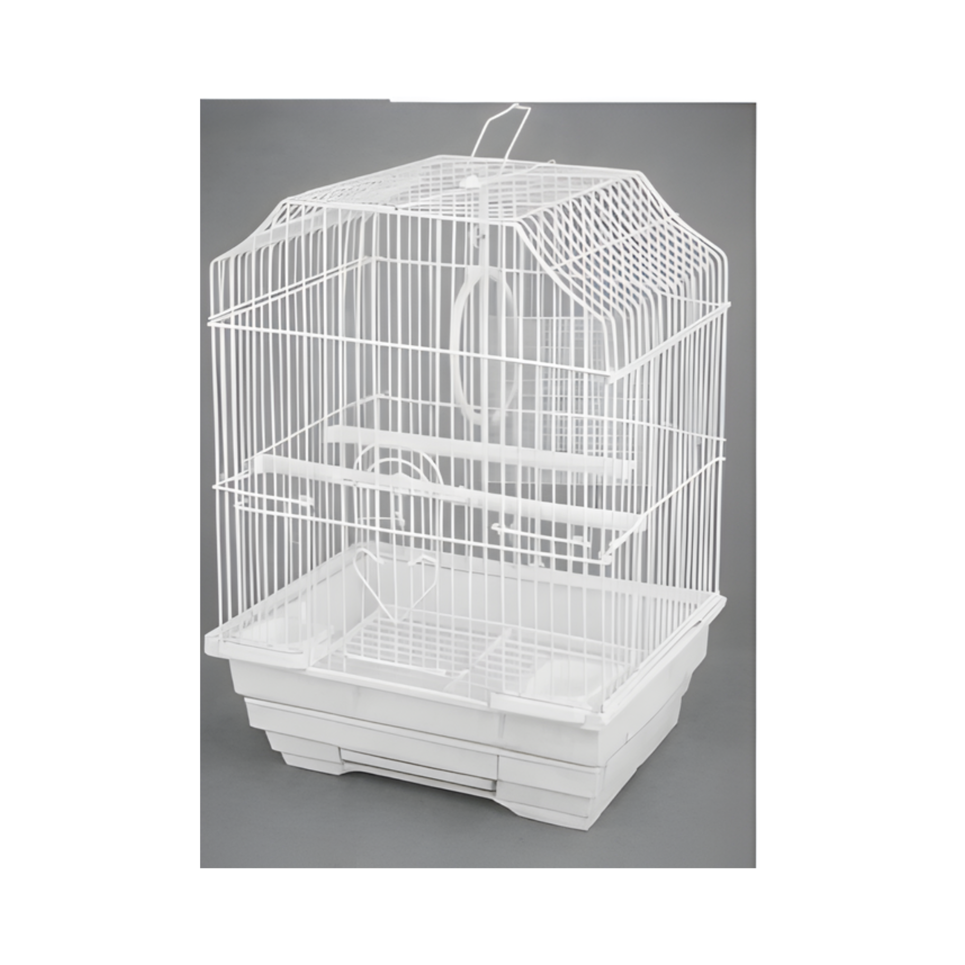Removable plastic tray. 2 feeders, 2 plastic perches.