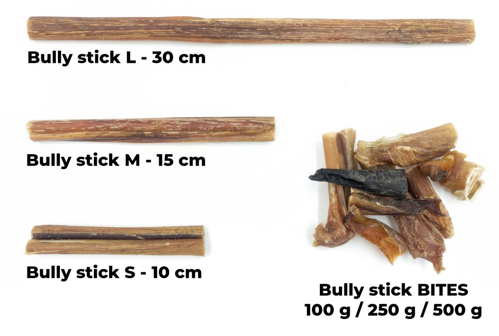 Bully sticks are made out of dried beef penises. They are robust and long lasting chews for dogs. Chewing them will satisfy almost every dog! They are rich in flavour but at the same time odor free. How is this possible? First of all, they are completely cleaned of blood and urine before preparation. Then, thanks to a fully controlled process, bully sticks are always kept at the right temperature and then carefully dried. As a result, they do not generate a strong, unpleasant odour. Bully sticks are an all-natural product – no preservatives, artificial colours or artificial flavours have been added.