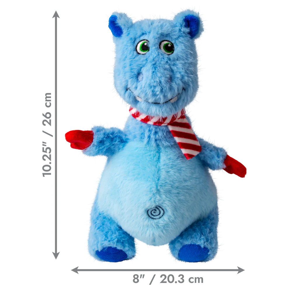 KONG® Holiday Knots Belly Hippo gives Santa’s bowl full of jelly competition! Soft and cuddly on the outside, a strong, durable rope ball on the inside makes its belly round and weighty. This dense internal skeleton rope ball adds heft and movement that entices instinctual thrashing, flinging, and light chewing. A squeaker in this hippo’s head piques dogs’ interest and adds excitement to play sessions. Knots Belly Hippo is also ideal for dogs who like to carry their toys, as well as for naptime snuggles. Dressed seasonally for the perfect holiday gift!