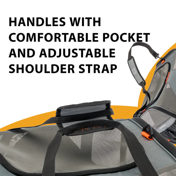 Additionally, the rear strap allows you to attach the carrier to a suitcase, making it ideal for air or train travel. The ergonomic handle and adjustable padded shoulder strap provide flexibility and comfort in every situation.